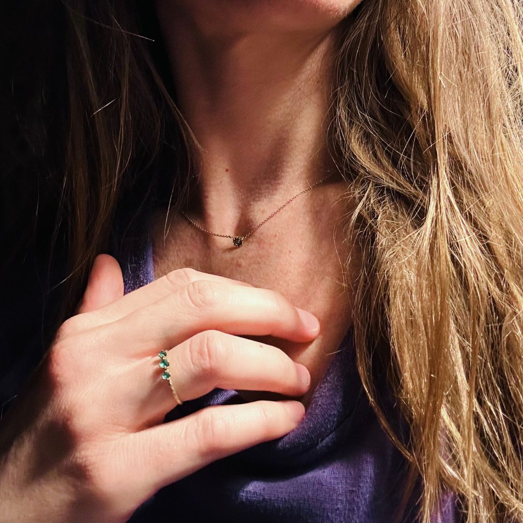 I’ve loved your jewelry for so long, and I really enjoyed meeting you in Oakland at Esqueleto. The grey flower necklace I bought when my middle son, Lucien, was born is so special to me. My sons have always picked me flowers from the beautiful wildflowers in the Bay Area, and this necklace reminds me of those moments. The emerald ring, which I bought when my third son, Aster, was born, has three stones, representing my three sons. Green always reminds me of new life, and it’s such a meaningful piece.