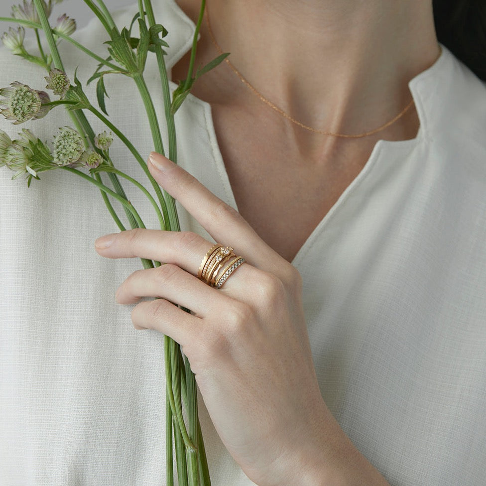 Simple yet sophisticated, this delicate ring can be worn alone as a statement piece or as part of a collection of stacking rings for a more contemporary look.
