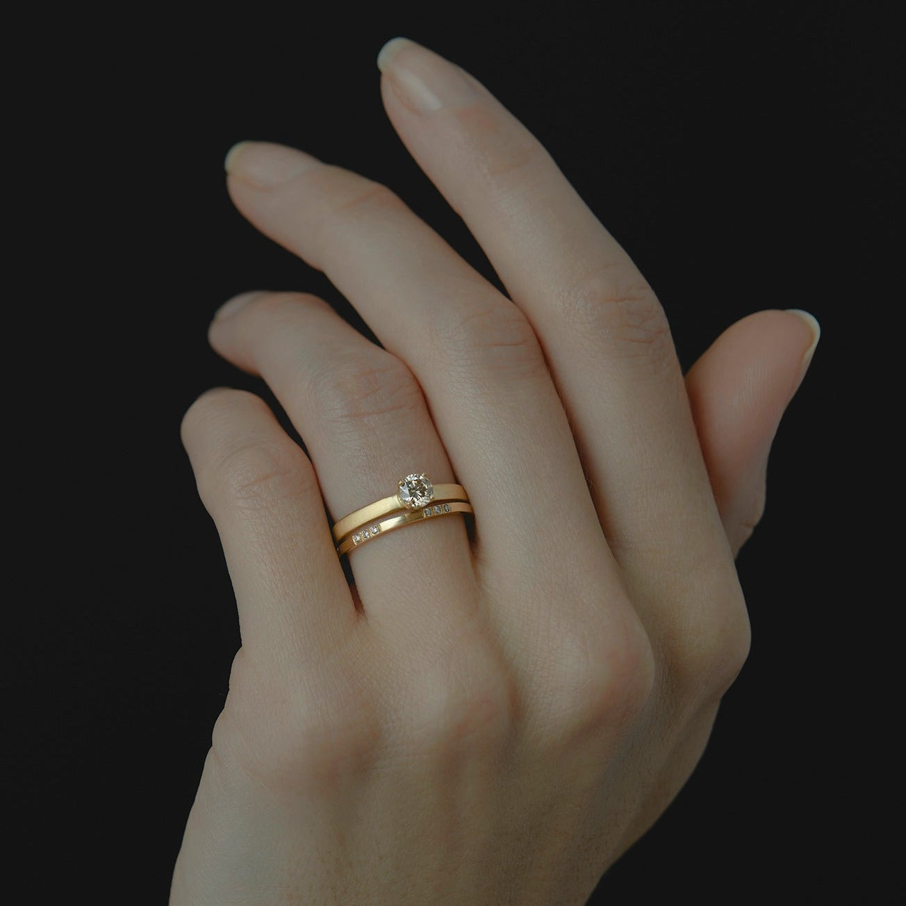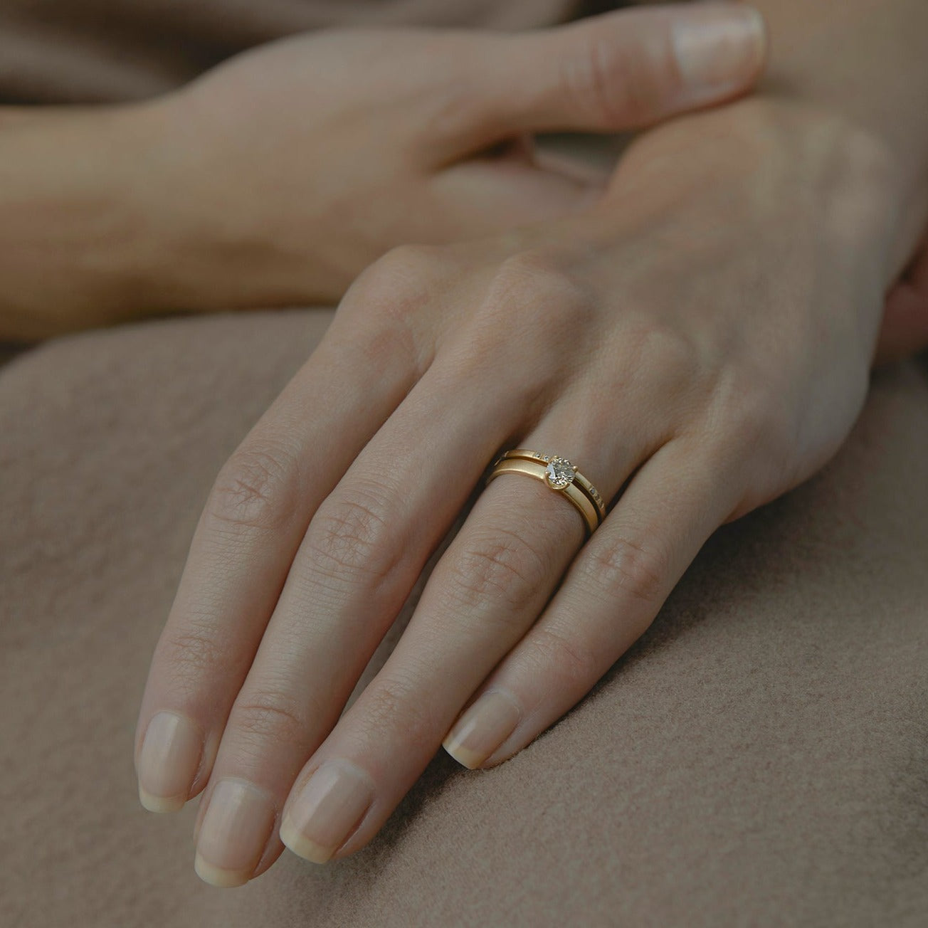 A unique take on the classic solitaire engagement ring, ours features an ever-so-softly rounded flat band, a shimmering satin matte finish, and four prongs to allow the beauty of the stone to really shine.