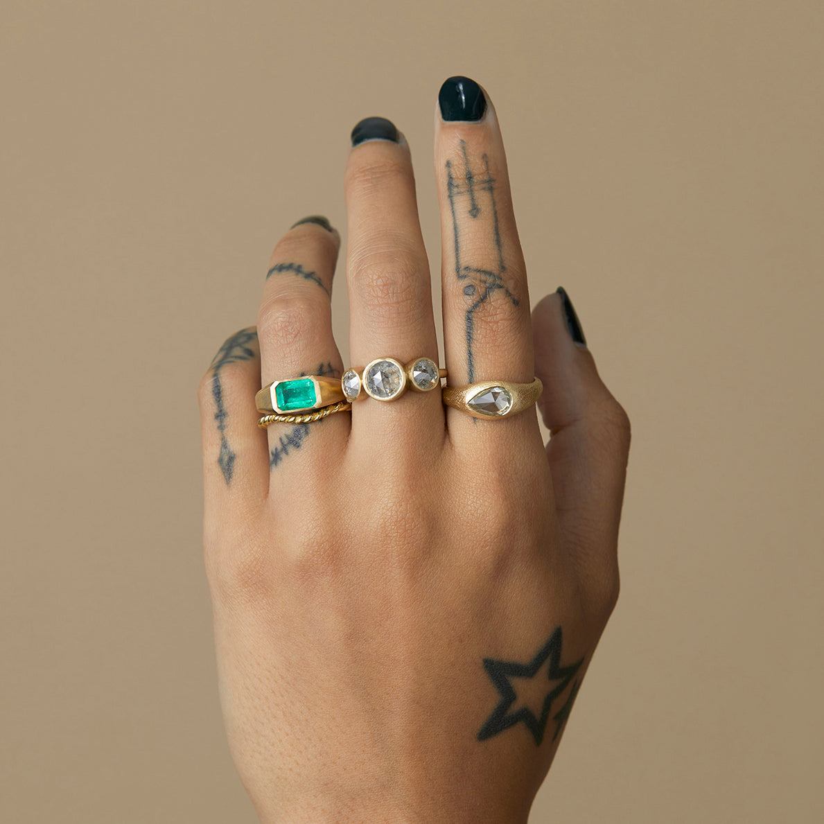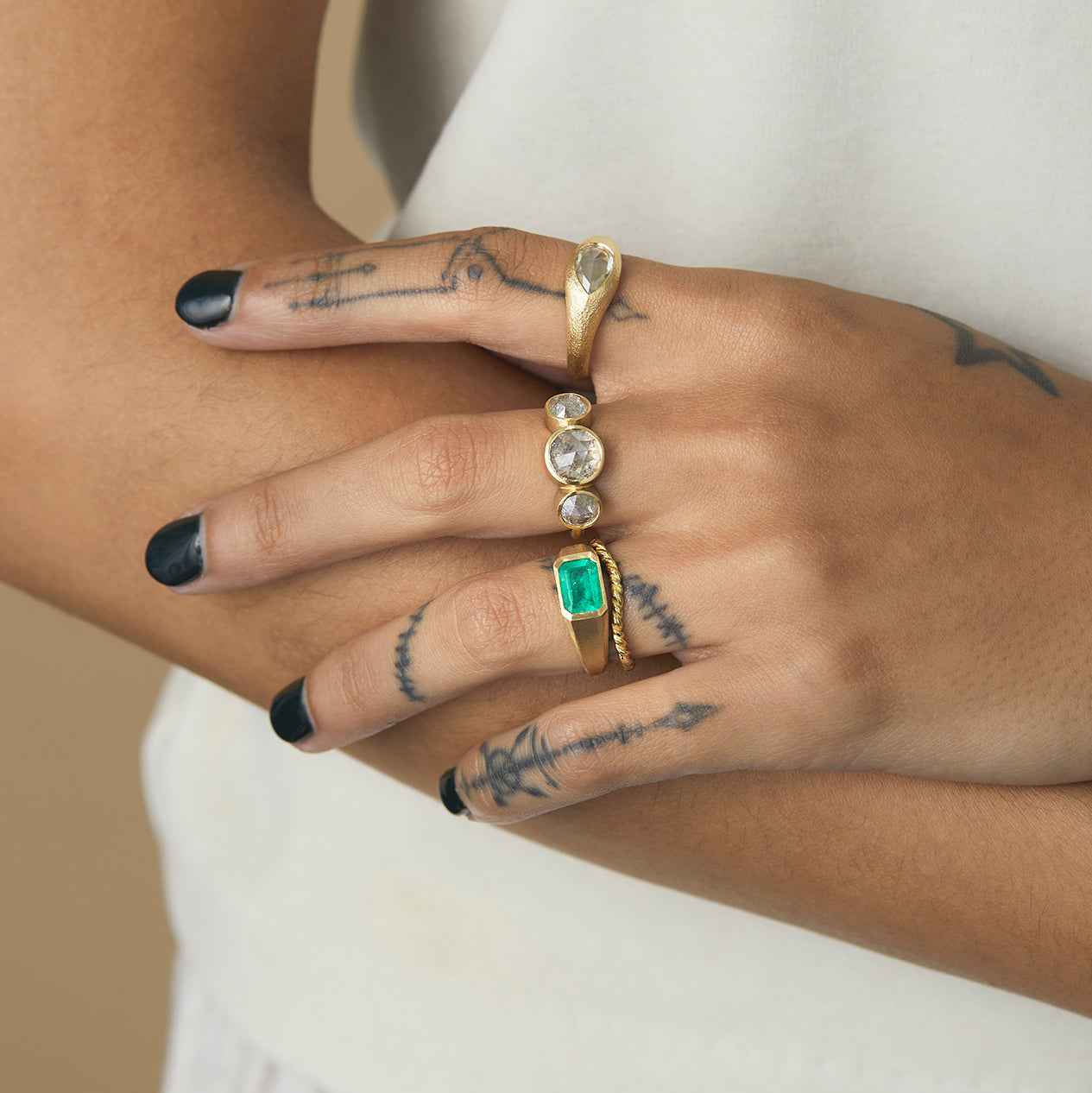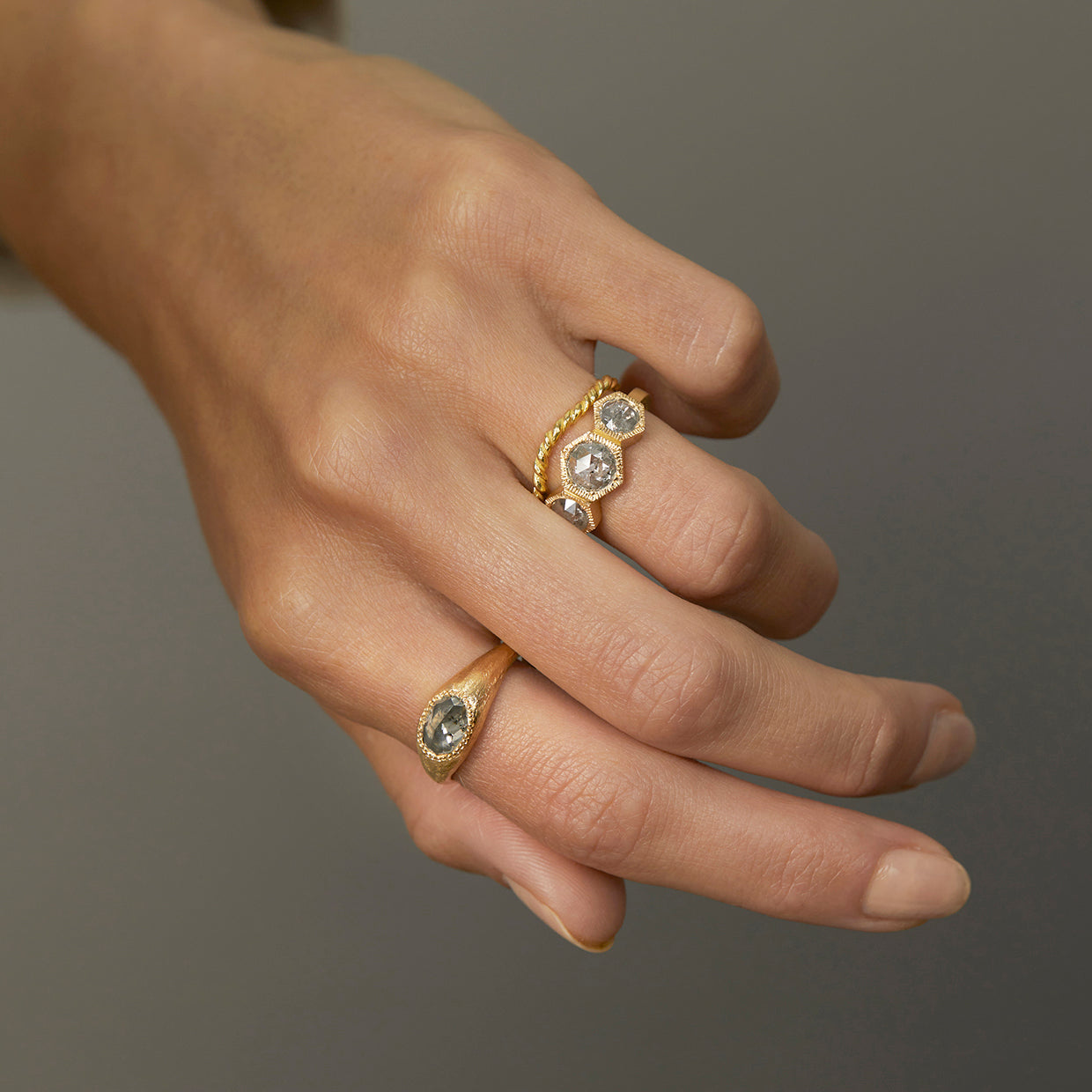 The Curved Rope Band features a delicate twisted rope design that gracefully curves around the finger, offering a delicate look thoughtfully designed to sit flush against a solitaire or three-stone ring.