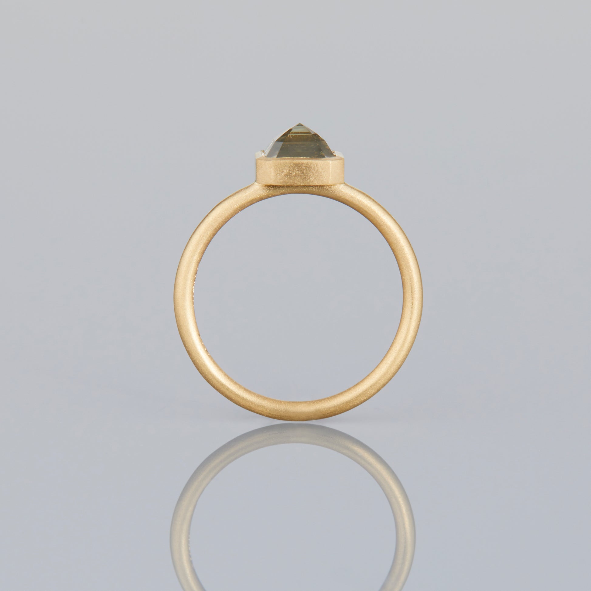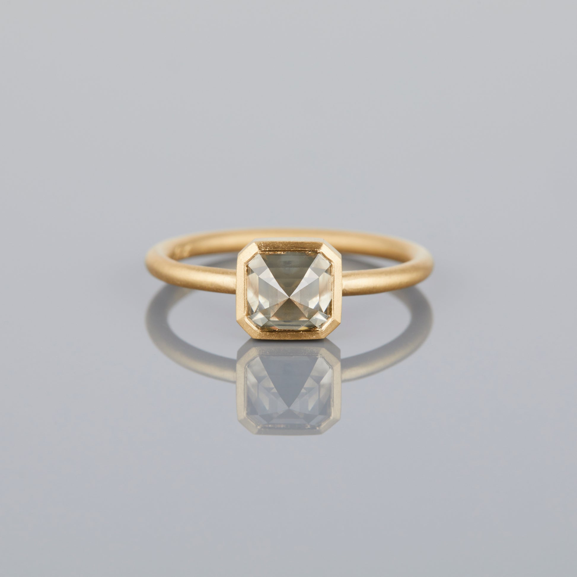 This unique diamond ring features a grey mogul cut diamond, renowned for its rare shape and distinctive facets that create a mesmerizing play of light. With origins in the 14th century, the mogul cut was favored by royalty for its ability to enhance a diamond's natural beauty.