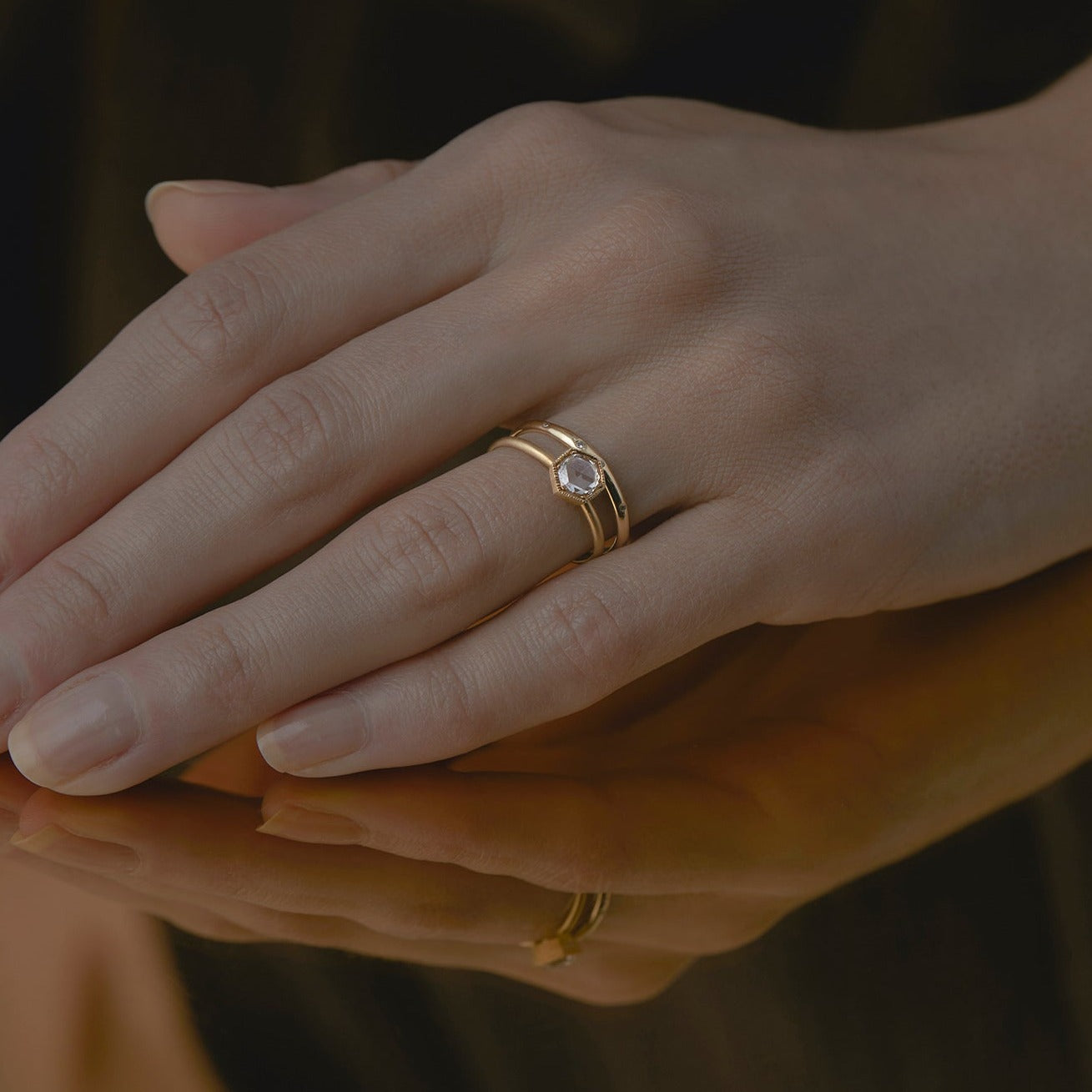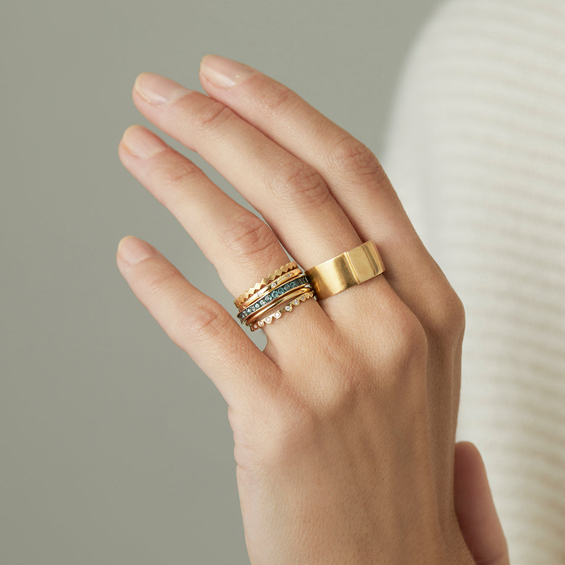 An organically shaped band with tiny, inlaid diamonds arranged in a constellation-like pattern for a hint of sparkle throughout. This special piece was the first ring that Satomi designed.