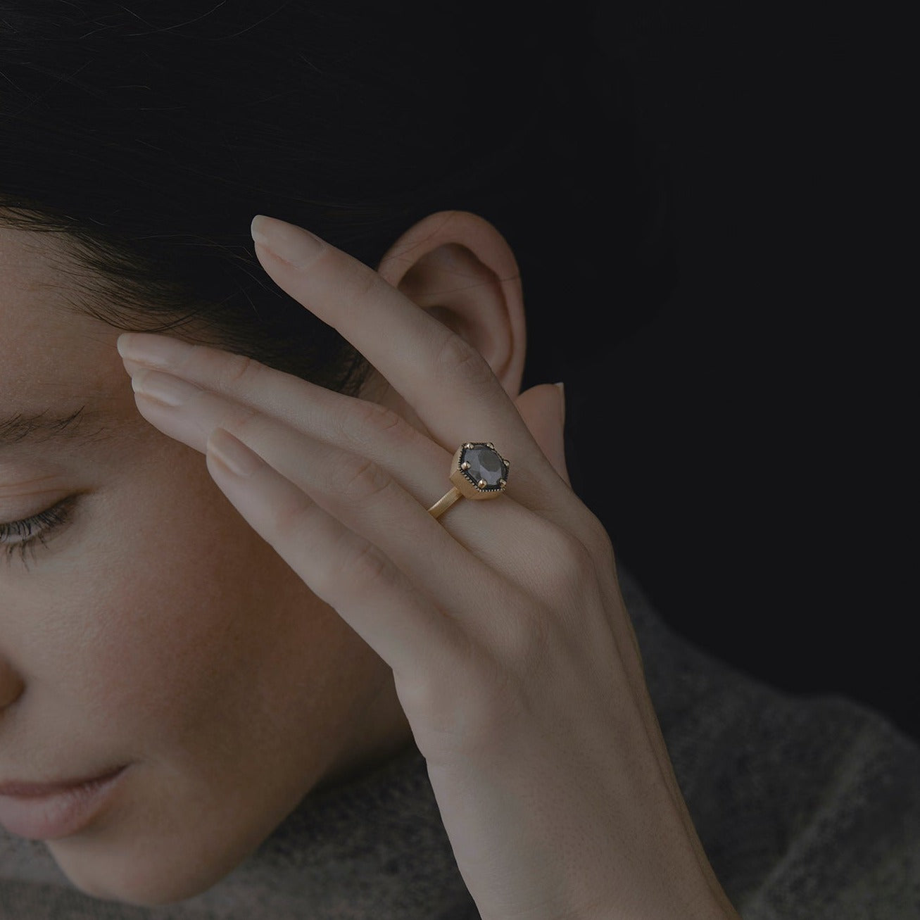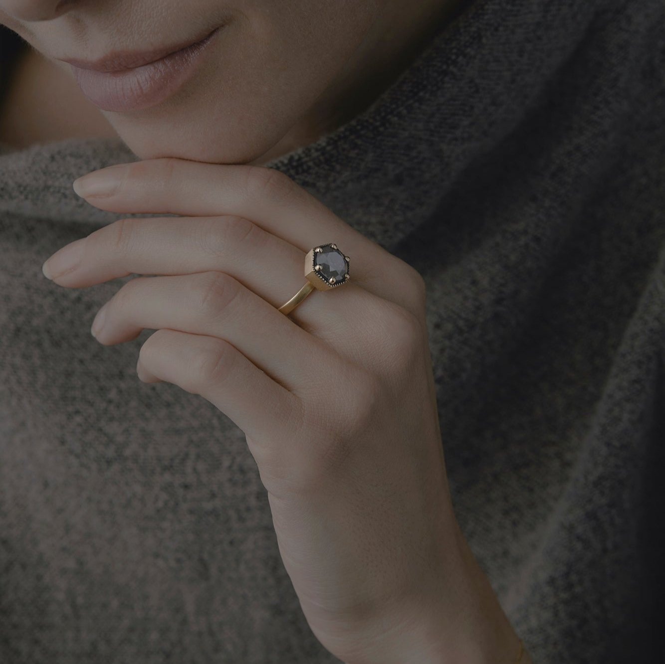 The diamond’s soft, smoky hues create a striking contrast against the sleek band, making this ring an exceptional piece for those who appreciates a bold design.